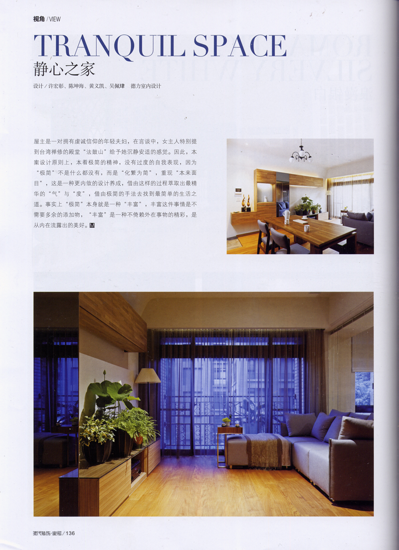 [文:小編] 上上個月很意外地來自中國的雜誌媒體「现代装饰家居杂志」來信邀稿,更意外地是這幾天收到雜誌了,驚覺這幾年中國的空間設計雜誌媒體的發展實在越來越「精彩」,進步之神速令人刮目相看,但是唯一遺憾的是兩地設計師的交流報導篇幅較少,除了長城下公社的中國建築師之外,我更期待可以看到中國內地的室內設計師作品。此回來自中国的出版社編輯部主動邀約指名這一個「靜心的家」,一個簡單而不簡單,豐盛而不紛擾的住家案,很意外…很開心….內地媒體開始欣賞除了浮誇犀利的現代空間,這一類絲毫不華麗的靜謐場域,在乎「收」的技巧更盛於「放」的概念,竟能收到來自遠方中国的回應,謝謝超有眼光的四美小姐。更多個案介紹或是設計概念可看這裡。