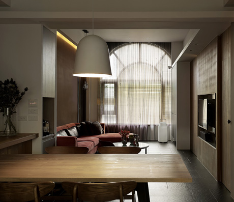 根據此宅的特性以及屋主期待的空間風格走向,設計師首先以「拉長中軸線」的方式進行空間配置,局部變更並採「雙滑門設計」與「摺疊門設計」讓空間的視覺得以延伸不受侷限,讓居主者在行進之間感受環環相扣的住家場域。