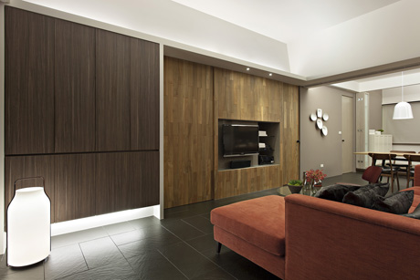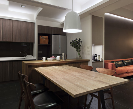 屋主在平面配置前便具體提出希望保留三房兩廳的配置,不過對於空間的定義持開放狀態,也就是說臥榻式的客房,可彈性擴充的書房等等的設計手法都是可接受的。此外,為了突顯空間既有的高挑性格,設計師選用巧克力色作為空間主色,藉由收縮色的壓縮作用讓空間達到一個平衡的尺度。