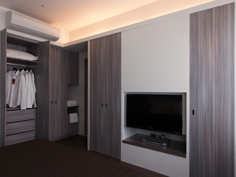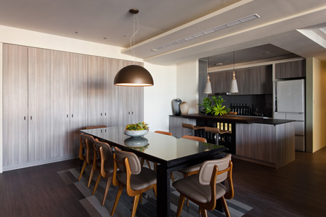 膳食空間是一家人聯繫情感與分享生活的最佳所在,幾經討論最後採開放式的廚房設計,結合吧台與料理台,將「輕食文化」引入,並與一旁的餐桌相呼應,如有賓客造訪,這個場域可充分滿足宴客的需求。最妙的是、電視櫃與客廳的佈局,也因開放式的廚房膳食空間而進行變更,讓所有人的視線得以相互交集,將整個公領域的效能與機動性發揮到最大。