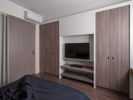 本戶位於新北市地區的三峽,屬於新興的郊區市鎮,屋主原住公館,但隨著年紀漸長,決定在此購屋,先以「度假形式」藉此歇息舒緩一下繁忙的都會生活節奏。話雖如此,所有的配置需求都依照一家三口,外加年邁的父母,總計五口的生活需求進行配置設計。三十八坪的空間規劃成三房兩廳兩衛。特別一提,孝順的屋主將最小的房間(紫色壁面那一間)留給自己,將採光好且擁有獨立衛浴的主臥挪為孝親房,至於不足之處,則是在客廳規劃一個開放式的小書房,屋主的音樂與光碟收藏全數收納在其後的收納櫃。